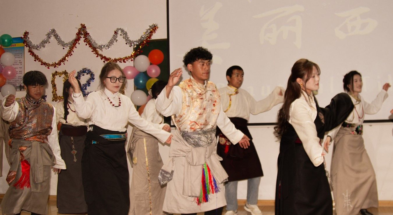 晚会分为三个环节:开场表演、节目表演和终场合照。开场由大学生艺术团带来热情洋溢的舞蹈,为晚会奠定了欢乐的基调。节目表演环节涵盖了独唱、街舞、民族舞等多种艺术形式,充分展示了学生们的才艺。其中,一首《欢舞踏新元》激昂澎湃,精彩演绎了青年大学生的活力与激情,赢得了现场观众的阵阵掌声。晚会高潮部分,藏族同学们的群舞《锅庄》展示了西藏的美景与文化,让我们深切感受到西藏人民的热情与活力,并向观众敬献哈达表示最高敬意。