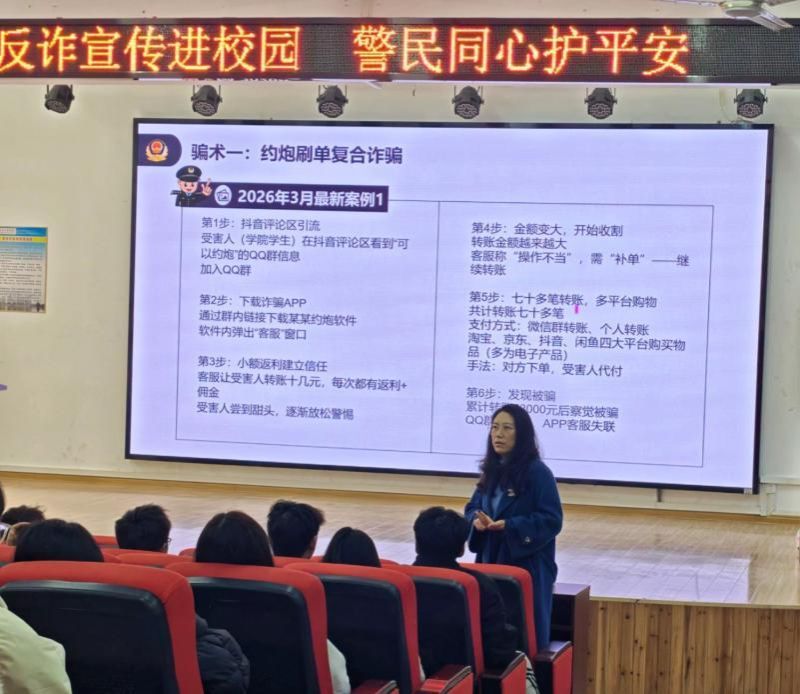 为切实提升大学生识诈、防诈、反诈意识与能力,守护师生财产安全,我院于2026年3月19日组织开展防电信诈骗安全教育专题宣讲活动。本次活动特邀反诈民警走进校园,为师生带来一堂贴近实际的反诈安全课,以警民联动的方式共同推进校园建设。