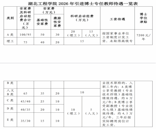 引进博士研究生待遇按下列标准提供基本安家费和科研启动经费(高层次人才的相关待遇和支持条件采取“一人一策、一事一议”,详细信息请登录“OK138太阳集团官网”(http://www.hbeu.cn)-《OK138太阳集团2026年面向社会专项公开招聘工作人员公告》和《OK138太阳集团 2026 年人才待遇标准》。
